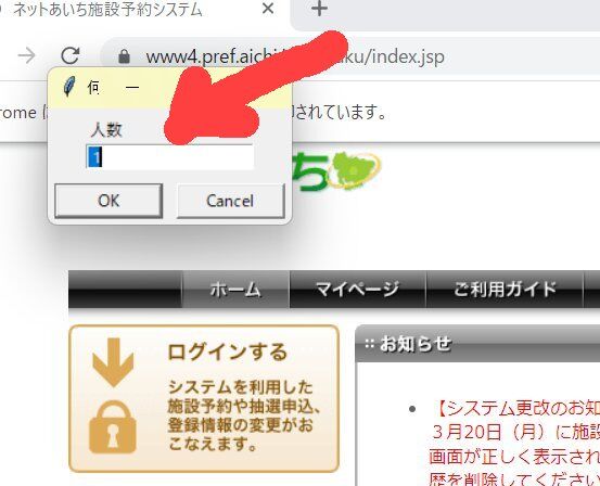 ④そのあと、すぐに拾いの情報を聞いて来ますが、OKボタンを押さない限り、プログラムはストップしています。この時、捨てる方のプログラムを動かして、捨てる寸前まで準備してください。そして小枠に拾う情報を打ち込みます、例えば、6月12日の7番コートを14~16時なら「6/12/7/14-16」という風にセットします。まだOKは押しません。