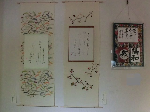 ご夫妻で多才なH様の奥様のほうの染色のグループ展に行ってまいりました。場所が春日井なのでグリーンのメンバーの皆さんも楽しませていただいているようです。Mさんの書とのコラボ作品もありとても素敵でした。H様は編み物、縫物、Mさんはパン、ケーキ作りがそれぞれ先生級・・・・・というか、先生。才能を十分発揮して人生を楽しんでいらっしゃいます。(お金が集まってくるかどうかは御本人にご確認ください) もちろんテニスも上手!どう生きるかは自分できめるもので、人と比べるものではありませんが、才能もお金も集まってこない身としては、ちょいと凹みます。ささやかに楽しむのも良しとしましょう。
